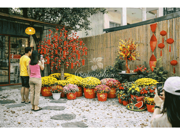 Đây là giải pháp Trang Trí Tết Bính Ngọ nhỏ gọn rất hiệu quả cho quán cà phê sân vườn, quán ăn phong cách làng quê.