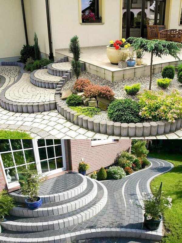 Các viên gạch, viên đá, sỏi được sắp đặt theo chủ ý về cả hình dạng và màu sắc tạo nên những đường nét cảnh quan sinh động cho sân sau. Với kiểu bố trí này góp phần tạo nên không gian chức năng như bậc cầu thang, phân chia mảng đất xanh; tạo lối đi dạo cho vườn sau.