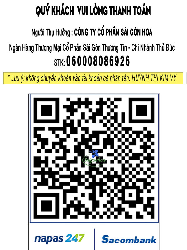 Để việc mua sắm và thanh toán tại Sài Gòn Hoa được diễn ra nhanh chóng, thuận tiện và an toàn, chúng tôi cung cấp nhiều hình thức thanh toán linh hoạt cho quý khách hàng. Dưới đây là các phương thức thanh toán mà quý khách có thể lựa chọn khi đặt mua cây xanh, hoa kiểng, vật tư cảnh quan hoặc sử dụng dịch vụ tại công ty.