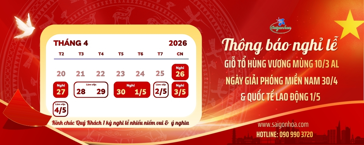 Hòa vào không khí cả nước kỷ niệm ngày Giỗ Tổ Hùng Vương Mùng 10 tháng 3 AL, chào mừng 51 năm ngày miền Nam hoàn toàn giải phóng & kỷ niệm 140 năm Ngày Quốc tế Lao động. Công Ty Cổ Phần Sài Gòn Hoa trân trọng thông báo lịch nghỉ như sau: