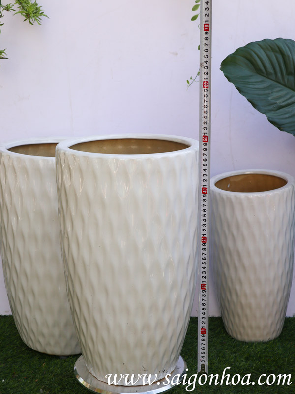 Với lớp men sứ trắng tự nhiên, bóng bẩy cùng các vân hình mắt lưới trên bề mặt thân chậu. Các vân lưới này không những tạo nên nét đặc sắc nổi bật mà còn giúp tăng độ bám; dễ dàng trong khâu vận chuyển. Chậu có dáng cao, thon, bền chắc, không độc hại phù hợp với nhiều loài cây cảnh khác nhau.