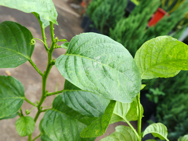 Lá hình tim, nhẵn, màu xanh đậm, mọc so le.