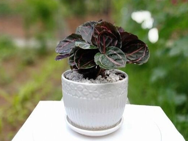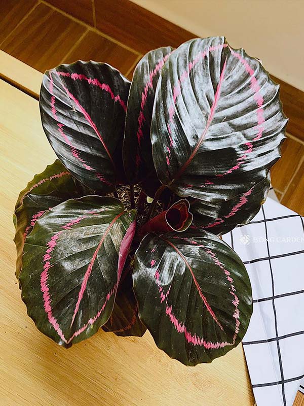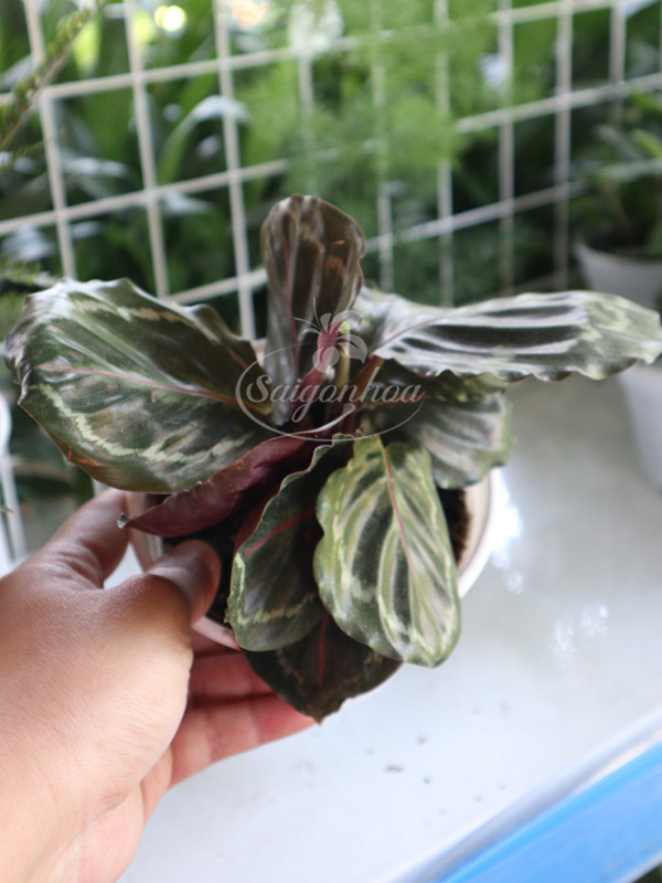 - Hình dáng: Lá cây có màu sắc pha trộn vô cùng bắt mắt và độc đáo. Những đường hoa văn sát gân lá trông gần giống như chiếc đuôi của con chim công. Mặt trên của lá có màu xanh đậm, mặt dưới lá có các vệt đốm đỏ tía.