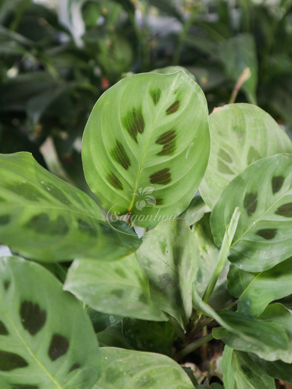 - Lá mọc trên cuống lá dài 25 – 30 cm xuất phát từ dưới đất (Thân rễ), hình bầu dục. Mặt trên lá màu xanh non, mép lá màu xanh đậm với các đốm xanh đậm xen kẽ giữa các đường gân lá.