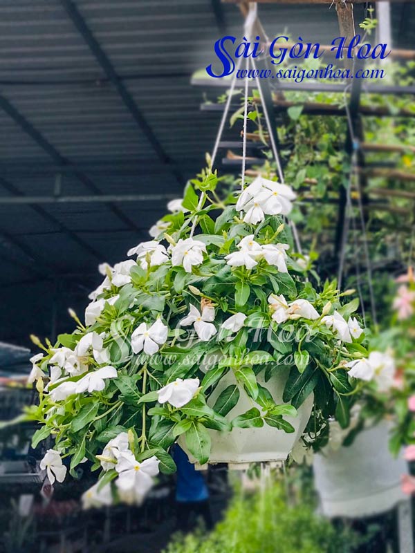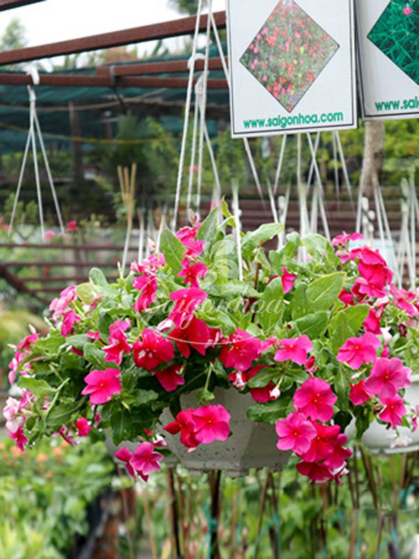 Cây dừa cạn rũ với dáng thân mềm mại, hướng xuống đất thích hợp làm hoa dừa cạn rũ chậu treo trang trí ban công, sân thượng, cửa sổ…