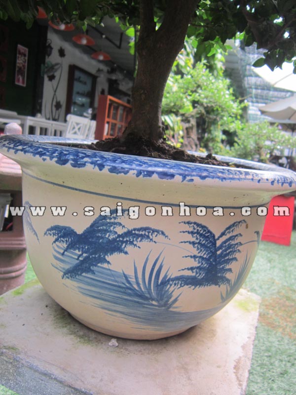 Cây kim quýt bonsai này có chiều cao khoảng 55 – 60 cm. Thân chính cây mọc thẳng lên ôm phần tán được uốn theo ý muốn và nhìn tổng thể giống hình tháp. Cây kim quýt bonsai cao 55 – 60 cm trồng trong chậu tròn nhỏ họa tiết đơn giản màu xanh và trắng.
