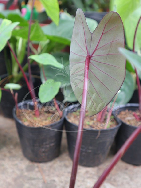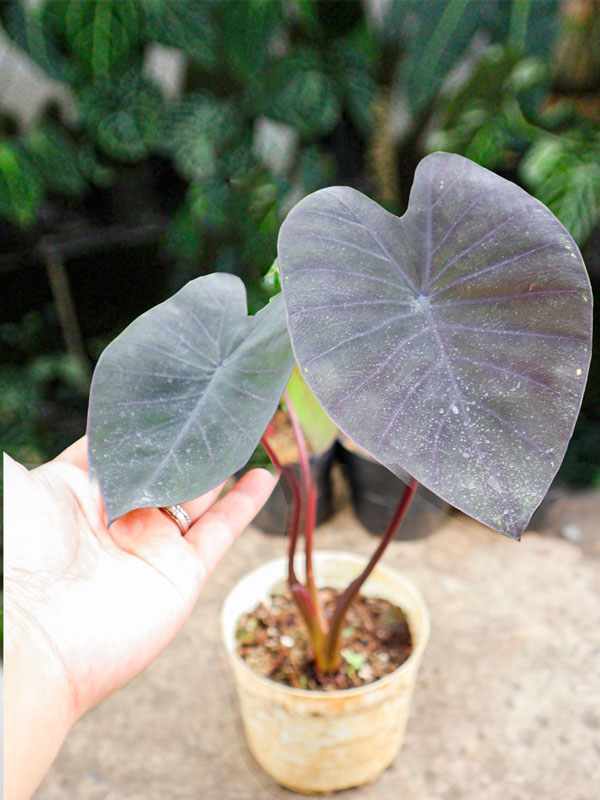 - Màu đen tuyền hoặc tím đậm, hình tim thuôn dài, đầu nhọn, mép nguyên, bề mặt mịn như nhung, gân lá chìm, kích thước 40-60cm (dài) x 20-30cm (rộng). Tùy vào môi trường ánh sáng, điều kiện ánh sáng nên cây môn đen có màu lá đậm nhạt khác nhau.