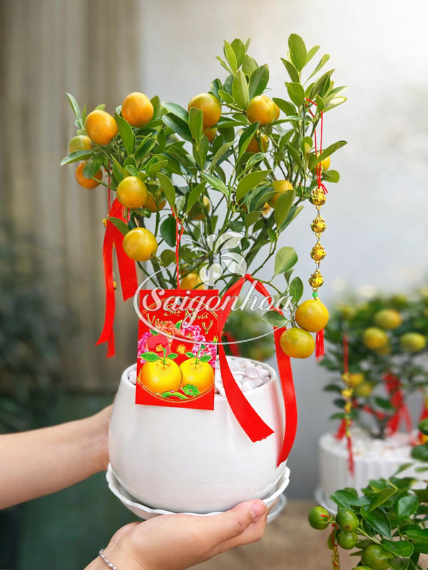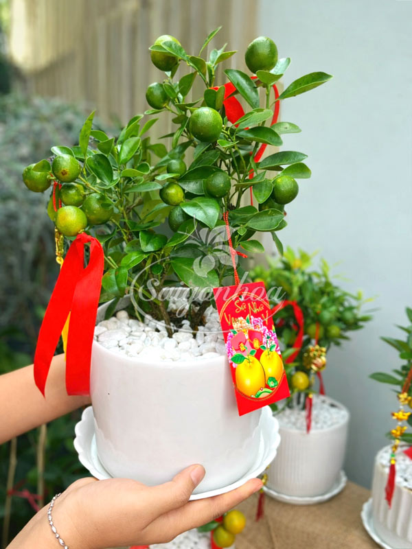 Chậu cây tắc để bàn quà tặng là lựa chọn trang trí Tết cực kỳ tiện lợi, nhỏ gọn và mang ý nghĩa may mắn, sung túc. Sản phẩm đã được trang trí sẵn với nơ đỏ và phụ kiện tài lộc, giúp bạn dễ dàng bày biện hoặc tặng người thân, khách hàng mà không cần chuẩn bị thêm.