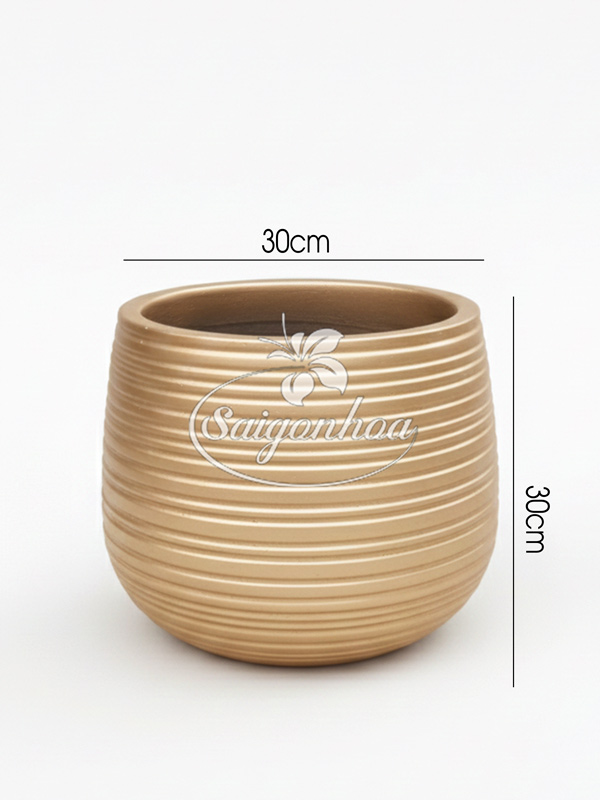 Chậu Đá Mài Trứng Chỉ Ngang Vàng Tươi 30 là loại chậu kiểng có thiết kế sang trọng, thường được phủ lớp sơn giả đồng, mang lại cảm giác cổ điển, quý phái. Với kiểu dáng hình ly cao, miệng loe và phần thân thu nhỏ như một chiếc cúp, loại chậu này thường dùng để trồng những cây cảnh có dáng đứng đẹp hoặc tán gọn.