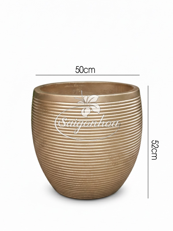 Chậu Đá Mài Trứng Chỉ Ngang Vàng Tươi 50 là loại chậu kiểng có thiết kế sang trọng, thường được phủ lớp sơn giả đồng, mang lại cảm giác cổ điển, quý phái. Với kiểu dáng hình ly cao, miệng loe và phần thân thu nhỏ như một chiếc cúp, loại chậu này thường dùng để trồng những cây cảnh có dáng đứng đẹp hoặc tán gọn.