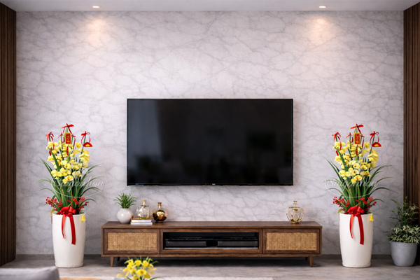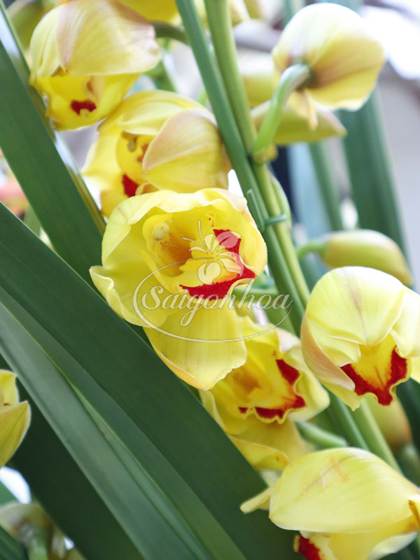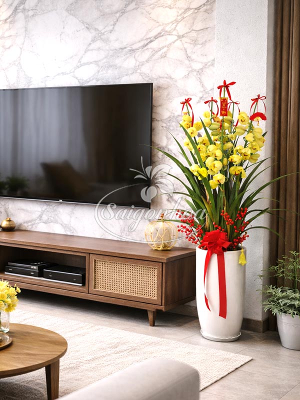 - Chậu địa lan vàng Tết chủ yếu được dùng để trang trí phòng khách, tiền sảnh, khu vực lễ tân, văn phòng hay không gian trưng bày Tết, mang lại vẻ đẹp sang trọng và đầy khí sắc mùa xuân.