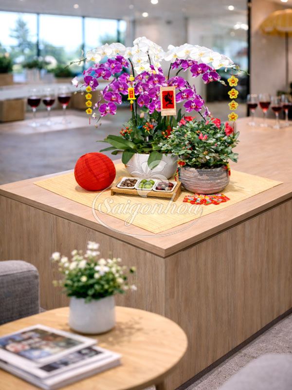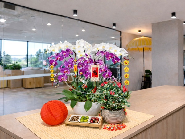 Combo Tân Xuân Cát Khánh là sự kết hợp hài hòa giữa lan hồ điệp sang trọng, đỗ quyên rực rỡ cùng phụ kiện decor Tết truyền thống giúp không gian làm việc trở nên trang nhã nhưng vẫn thể hiện đẳng cấp chuyên nghiệp. 1 bộ Combo decor bàn tiếp khách văn phòng sếp, bao gồm: