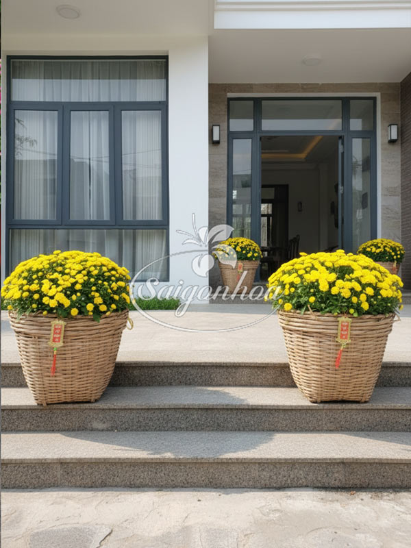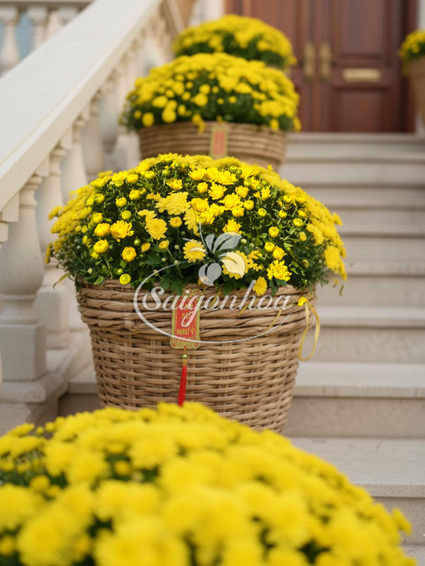 - Hoa cúc mâm xôi giỏ tre trang trí Tết đặt trước thềm nhà vừa mang đến nét xuân ngọt ngào, rạng rỡ và tươi mới hơn vừa thu