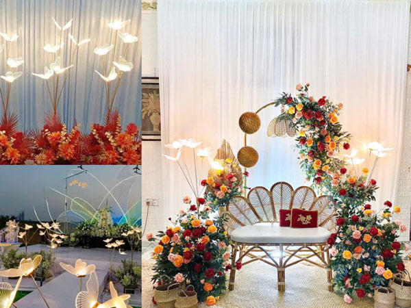 Mỗi con bướm được trang bị đèn LED ánh sáng vàng dịu nhẹ, tạo nên hiệu ứng lung linh, làm nổi bật lối đi dẫn đến sân khấu trong tiệc cưới tại khách sạn hoặc sân vườn.