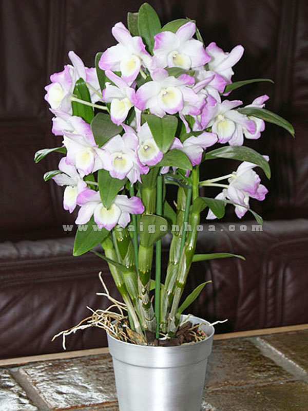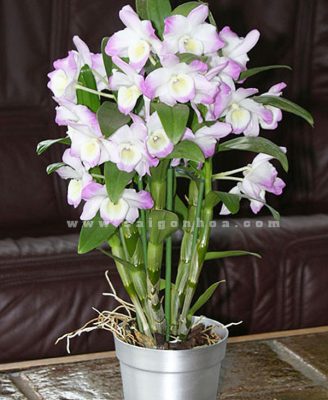 Chậu hoa lan Dendro màu trắng tím có chiều cao trung bình từ 50 cm – 80 cm. Chậu cây hoa có 8 – 10 vòi bông, màu hoa tươi sắc. Chậu hoa phù hợp đặt nơi bàn làm việc, bàn tài liệu, cửa sổ, kệ tủ hồ sơ, quầy tiếp tân, trang trí trong khung cảnh trang nghiêm…