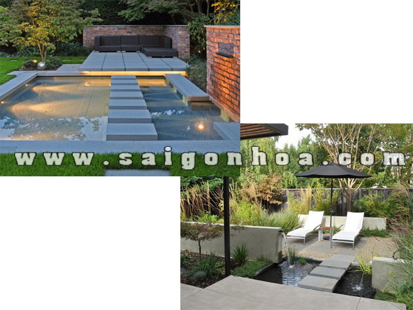Patio và nước có sự kết hợp yếu tố nước với patio. Nước sẽ làm thay đổi cảnh quan xung quanh bởi vì nó là một yếu tố có thể động hoặc tĩnh tùy theo cách sử dụng của con người.