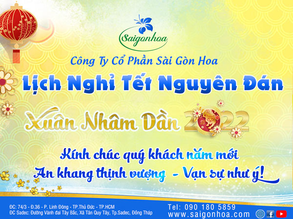 Thông Báo Lịch Nghỉ Tết Nguyên Đán Xuân Nhâm Dần 2022 Công Ty Cổ Phần Sài Gòn Hoa trân trọng thông báo đến toàn thể quý khách hàng, quý đối tác cùng toàn thể nhân viên lịch nghỉ tết Nguyên Đán Xuân Nhâm Dần 2022. [caption id="attachment_88453" align="aligncenter" width="1200"] Thông Báo Lịch Nghỉ Tết Nguyên Đán…