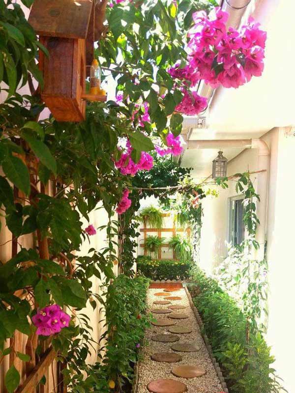Sân vườn hai bên hông nhà thường diện tích khá hẹp, làm đường dạo thêm giàn hoa phía trên tạo ra màu sắc tươi mát từ đó tạo nên không gian nghỉ ngơi, thư giản vô cùng lý tưởng cho cho gia chủ.