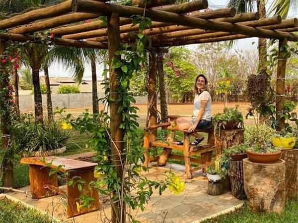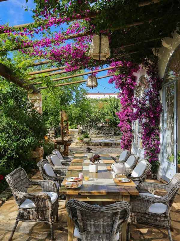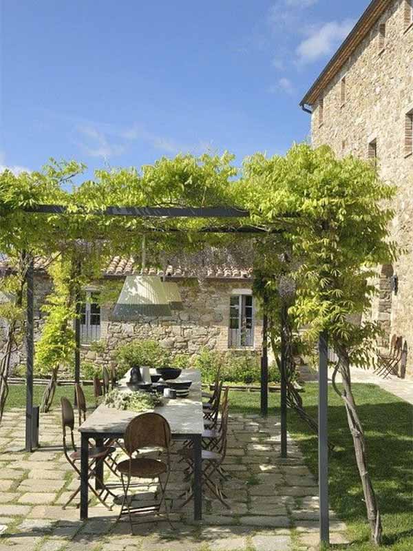 Tạo cây leo giàn trong sân vườn để che bóng mát, bố trí thêm bàn ghế ngồi, không gian lý tưởng cho một buổi tiệc nhỏ ngoài trời.