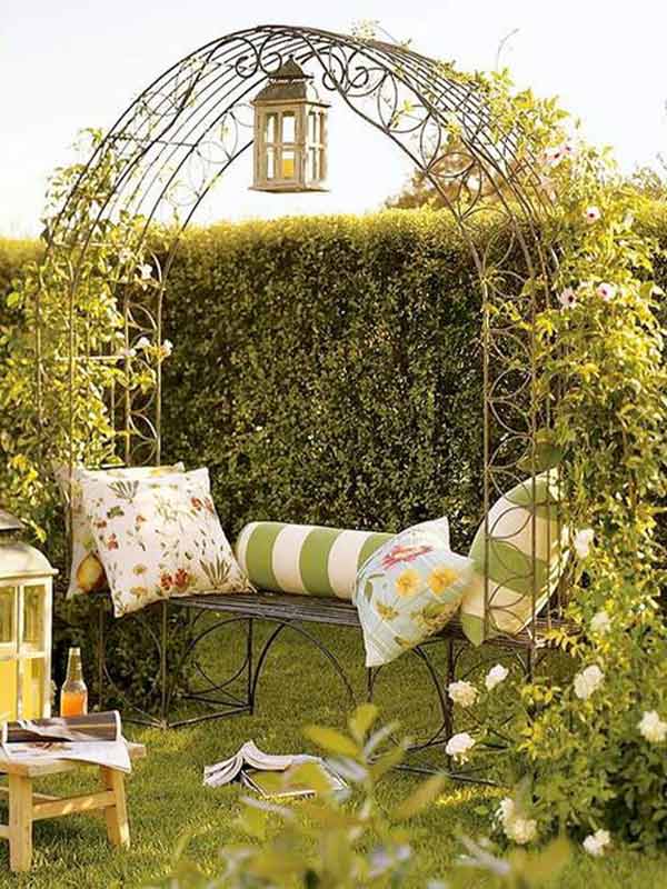 Tạo điểm nhấn trong vườn bằng cách bố trí một số giàn hoa nhỏ, phía dưới là ghế ngồi để đọc sách hoặc nghe nhạc, tạo ra một khung cảnh thơ mộng.
